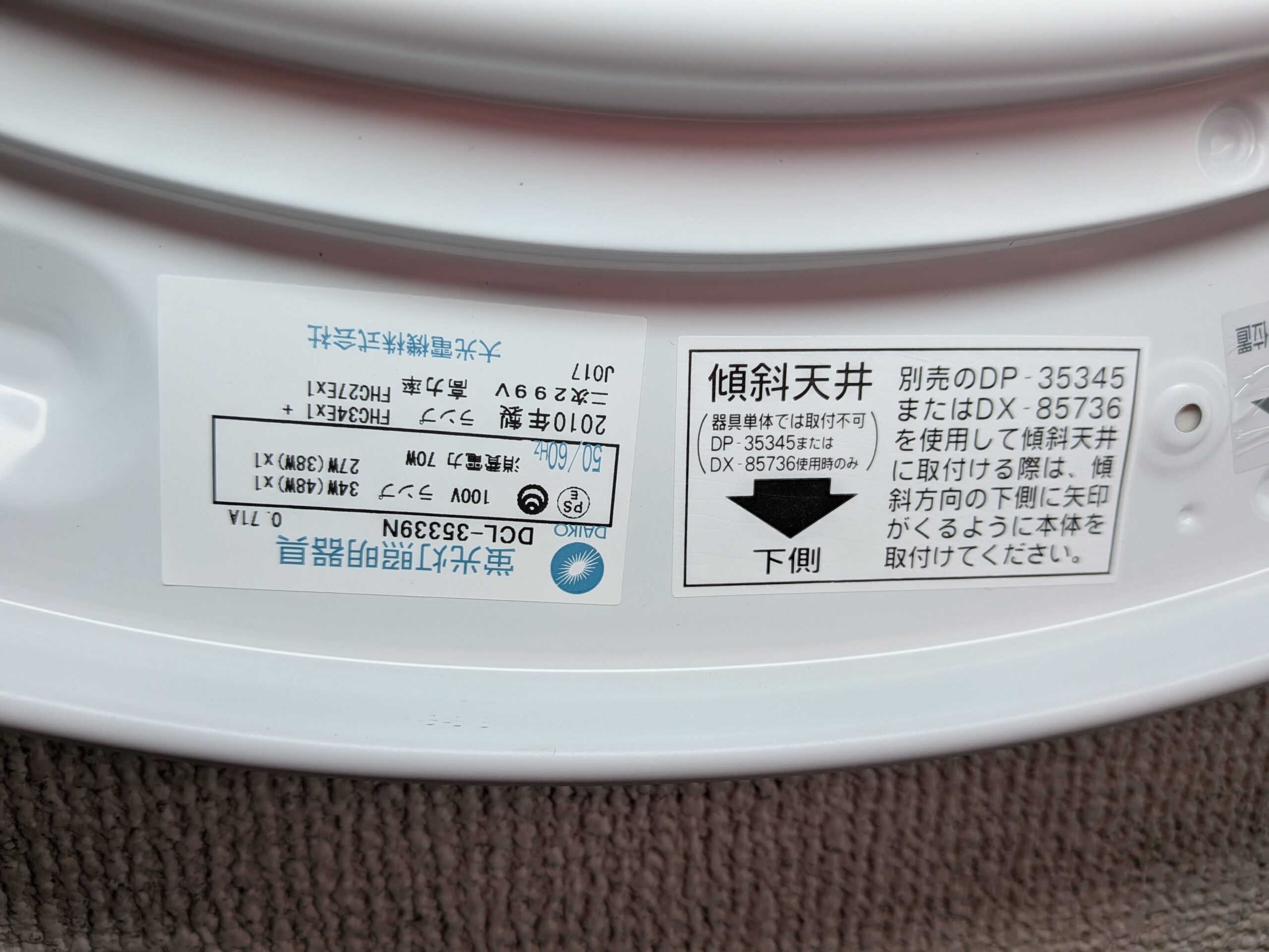 まず部屋のシーリングライト大光電機のDCL-35339Nは傾斜天井についています。