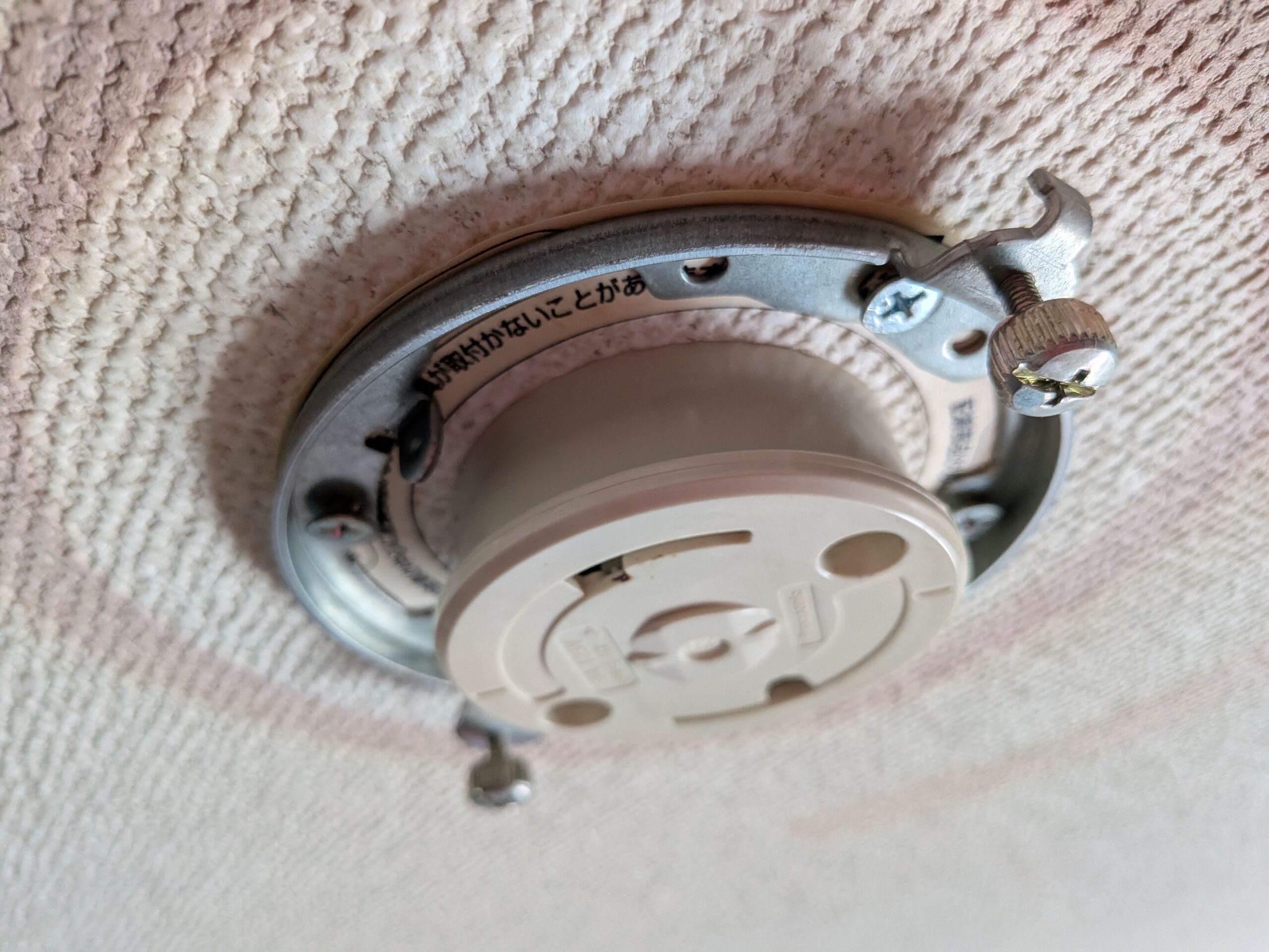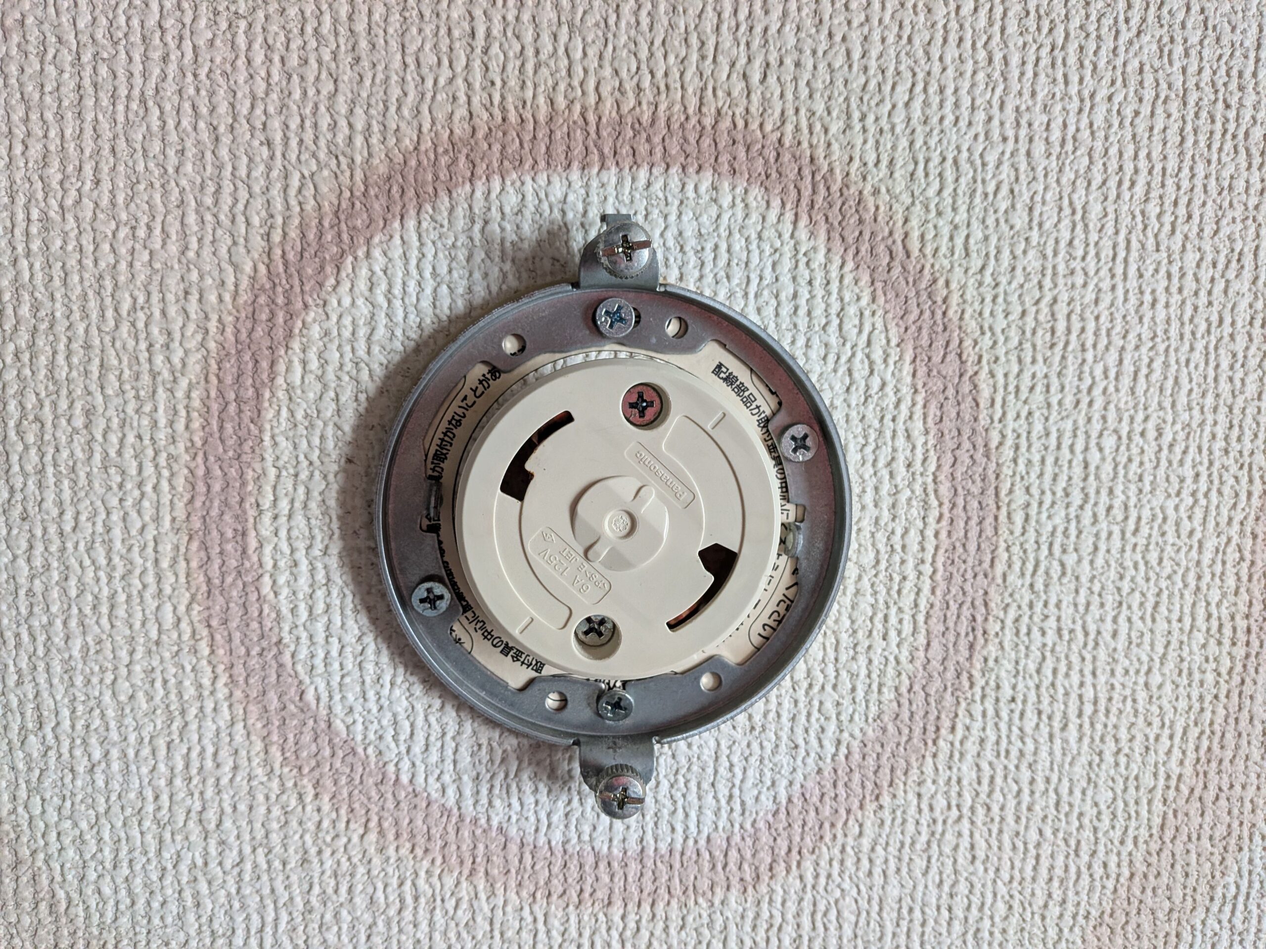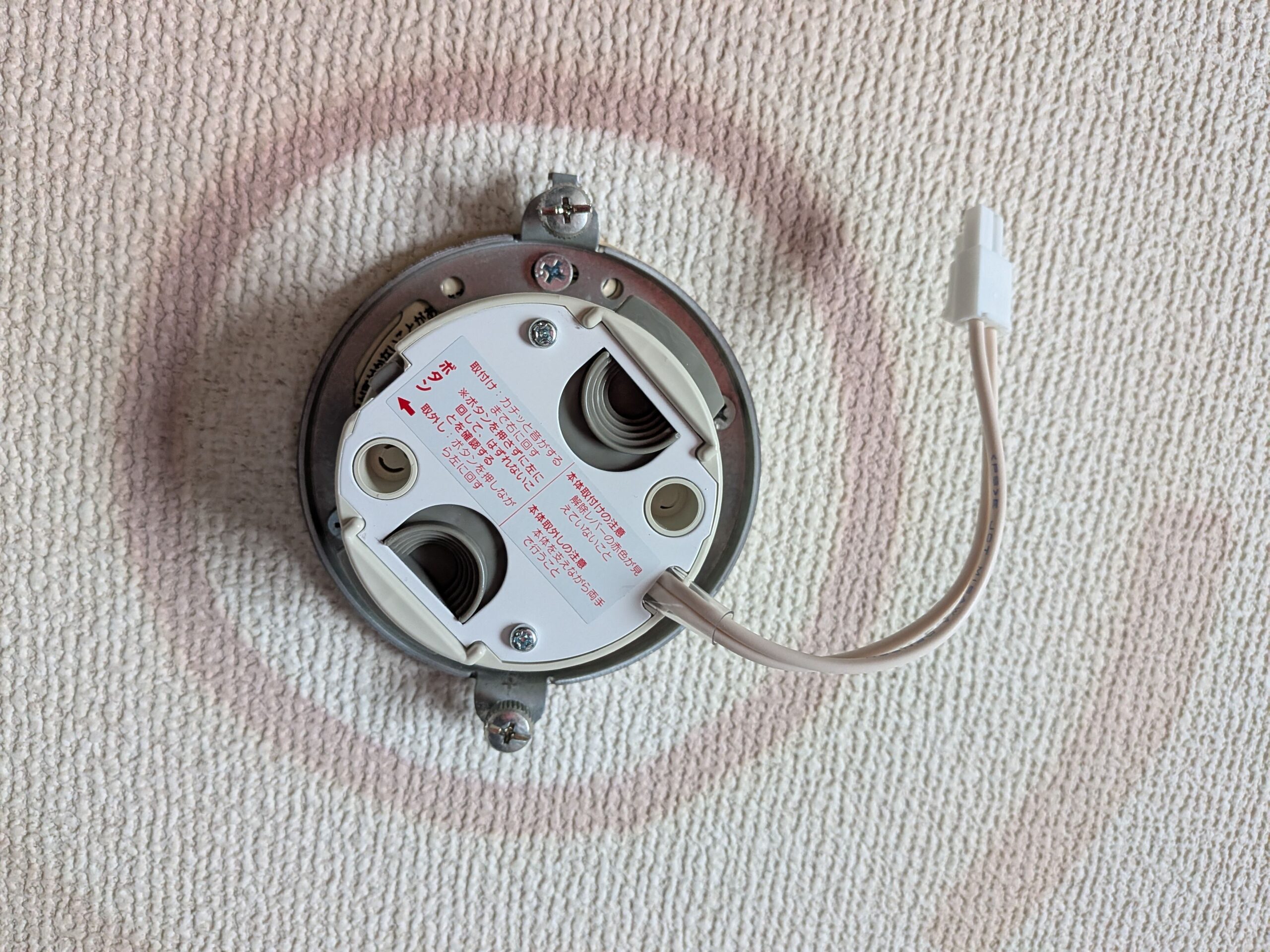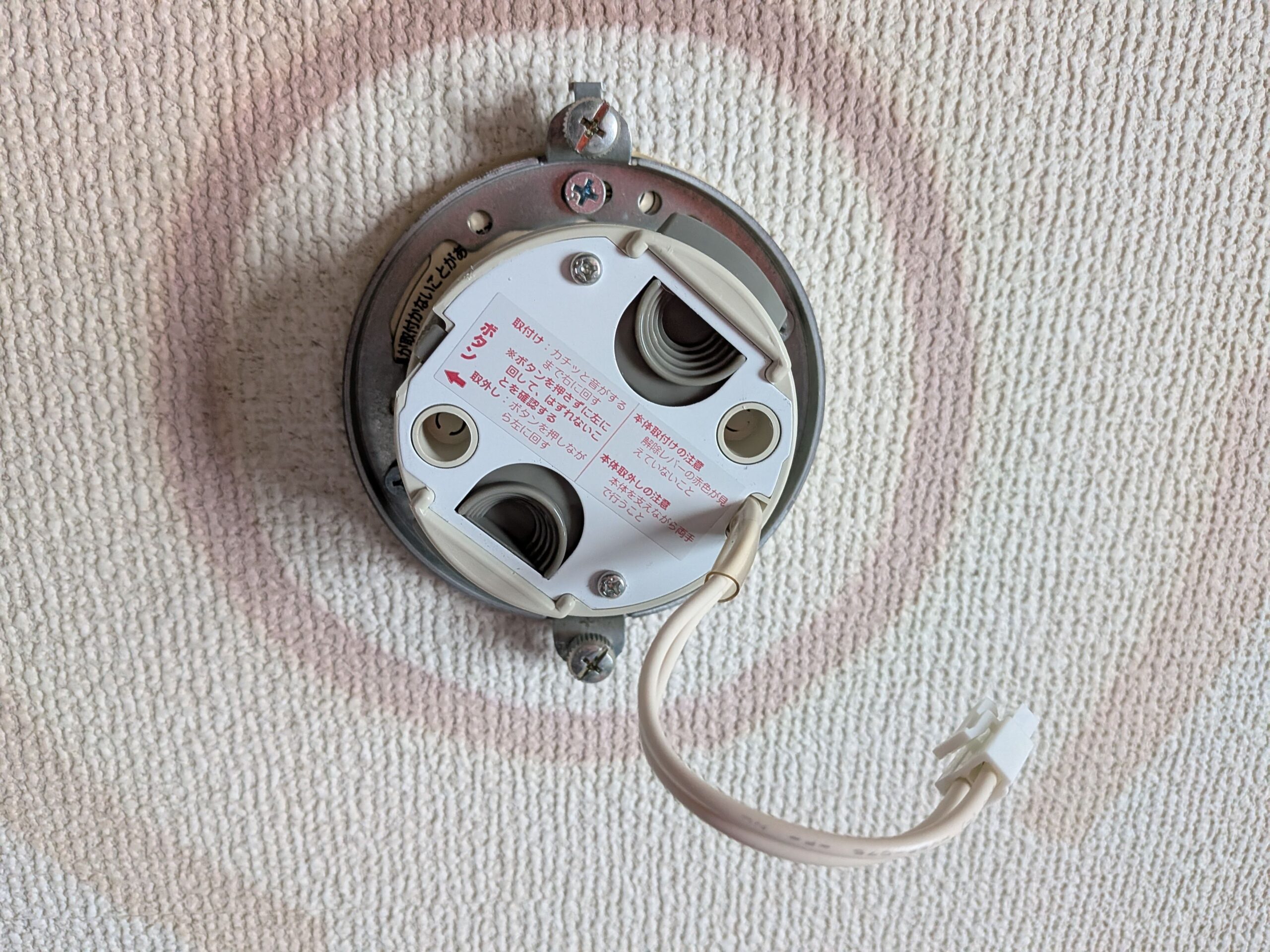 ツバ付丸形引掛シーリングも付属していたので木ネジを外して交換しようとしましたが、こちらは天井から伸びているコードと繋がっていたのでやめました。どうやらこれを交換するには電気工事士の資格が必要らしいです。